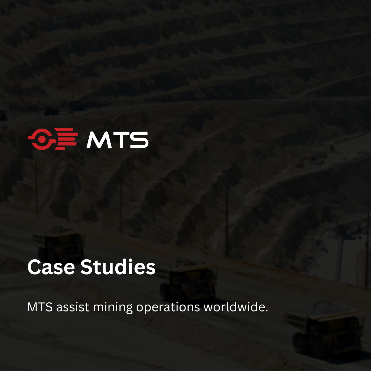 A mining operation in a desert landscape with trucks on a dirt road, overlaid with the MTS logo and the text 'Case Studies' and 'MTS assist mining operations worldwide.'