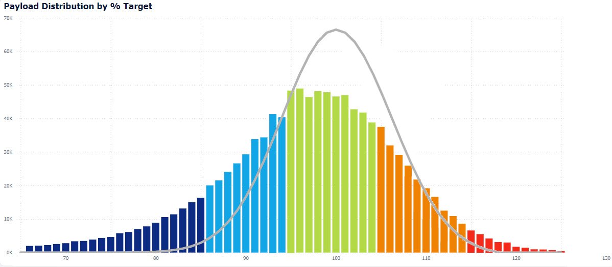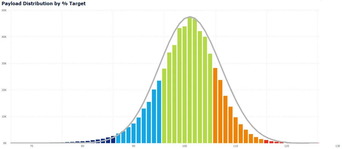 The implemented measures had a significant positive impact on the mine’s operations. In the figures below, it’s evident how the payload histogram changed from a widespread distribution to something far tighter. Here, far more operators were hitting the payload targets alongside the occurrence of far fewer underloading and overloading events.